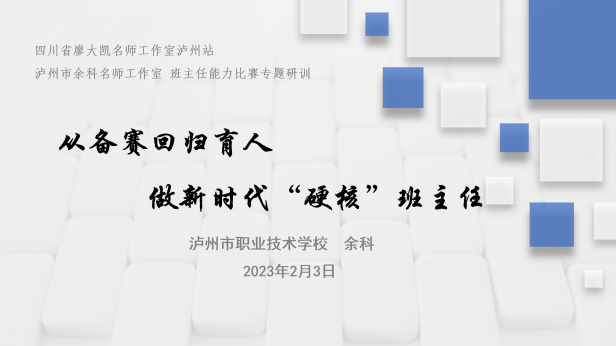 为充分发挥名师工作室的示范引领作用,助力中职班主任专业成长,提升班主任的建班育人能力,2月3日上午,四川省廖大凯名师工作室泸州站负责人、泸州市余科名师工作室领衔人余科,在泸州市职业技术学校立言厅为学校全体班主任进行了以“从备赛回归育人 做新时代‘硬核’班主任”为主题的班主任能力比赛专题研训活动。