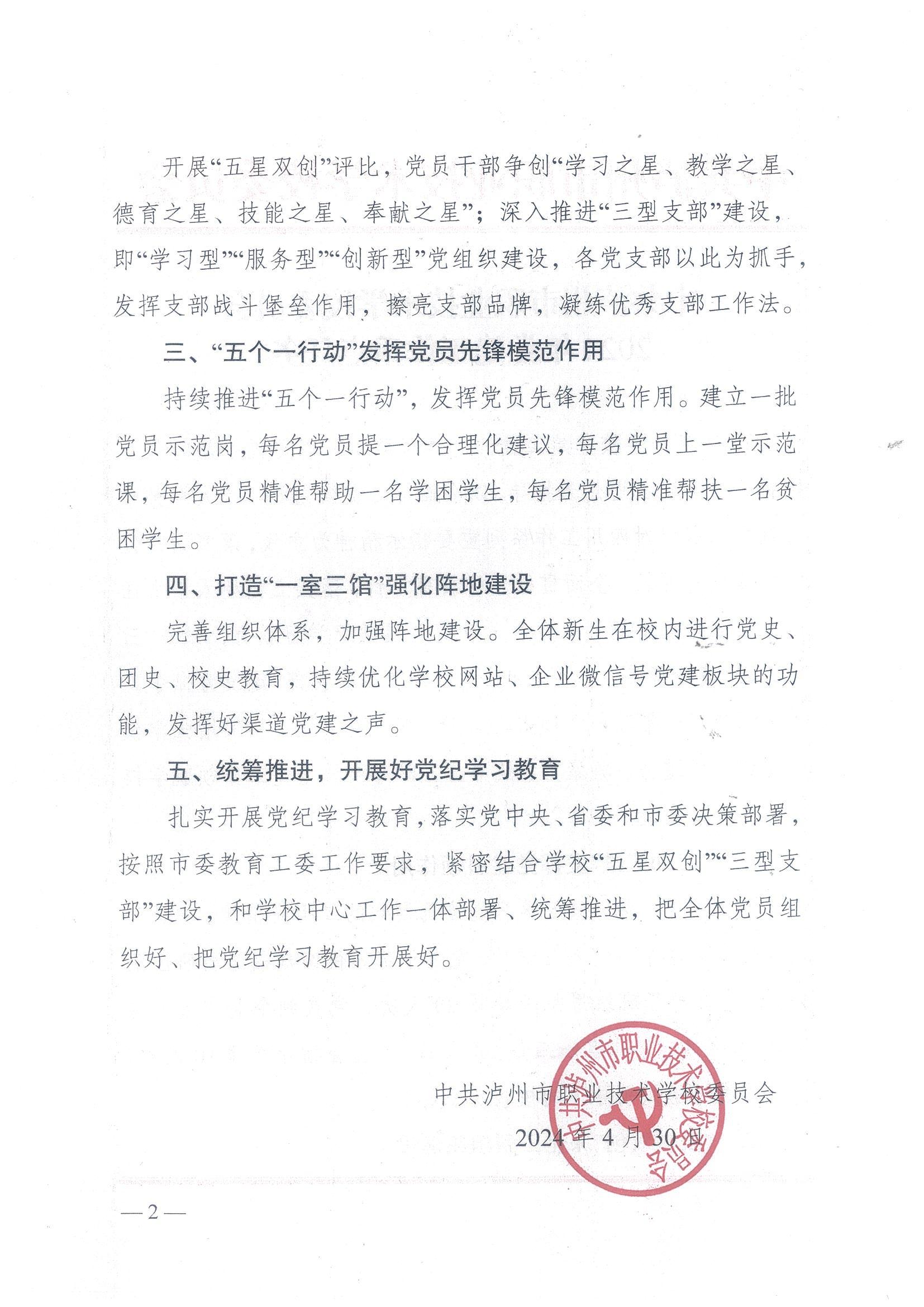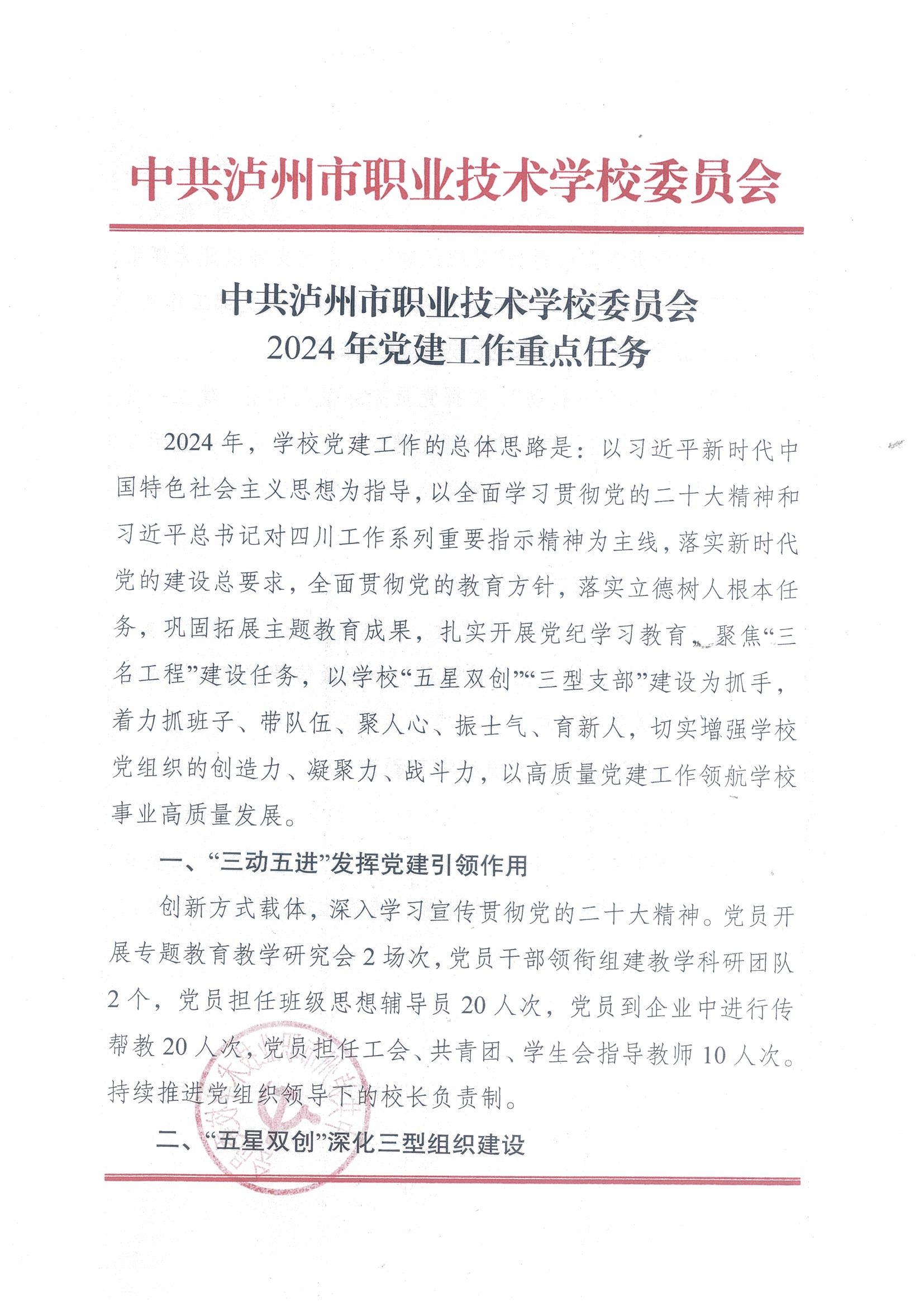中共泸州市职业技术学校委员会2024年党建工作重点任务