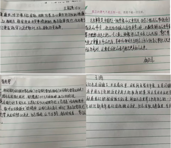 20班刘登鑫同学深有感触的写到,“9.18事变让我深刻地知道了弱国无尊严、落后要挨打的事实,我也从中看到日本帝国主义的丑恶嘴脸、国民政府的腐败以及百姓的无奈,因此我们应勿忘国耻、铭记历史,努力学习科学知识,让祖国更加强大。”