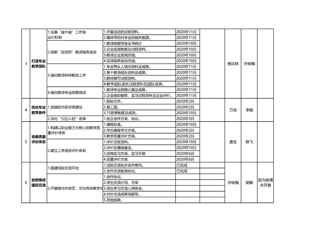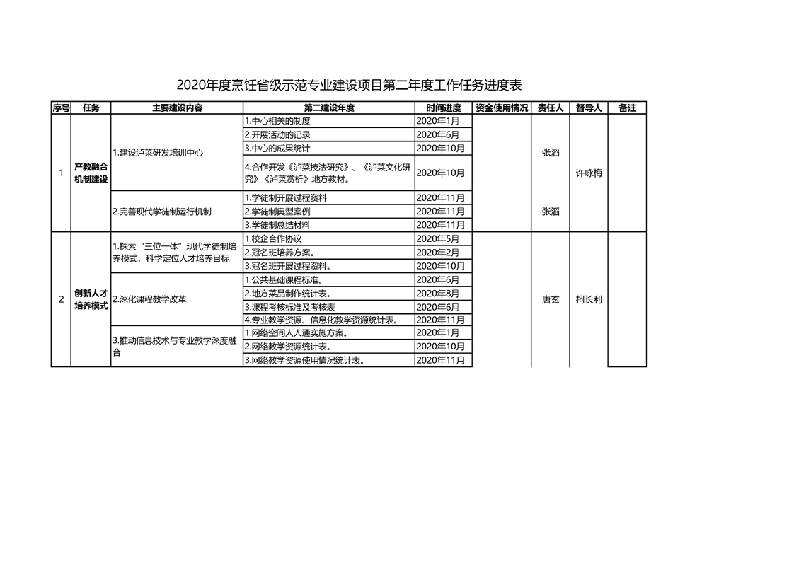 当前页面:中餐烹饪终期验收 >> 专业建设任务 >> 1.1项目建设总体情况 >> 1.1.1工作机制与举措 >> 1.1.1.2任务分解制定保障