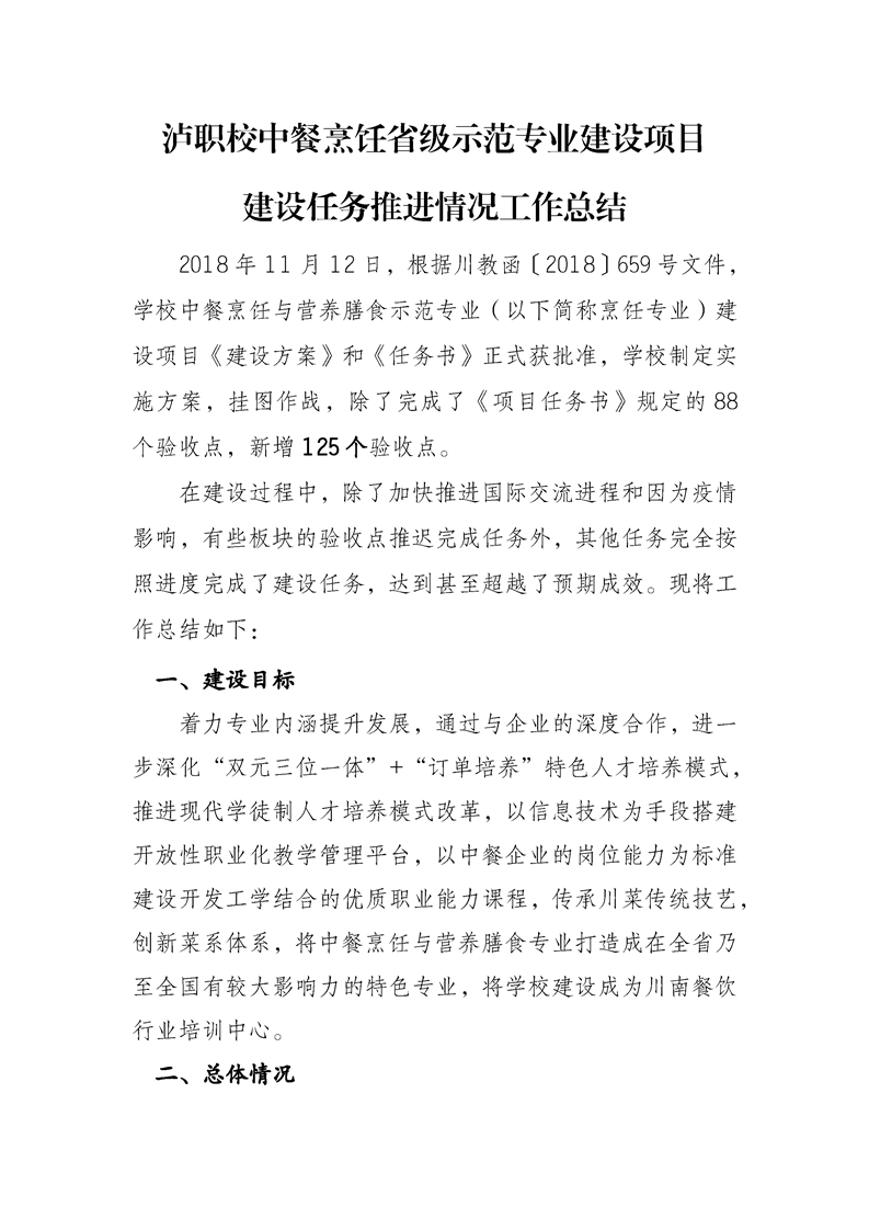 当前页面:中餐烹饪终期验收 >> 专业建设任务 >> 1.1项目建设总体情况 >> 1.1.2主要任务完成情况 >> 1.1.2.1按进度完成建设任务