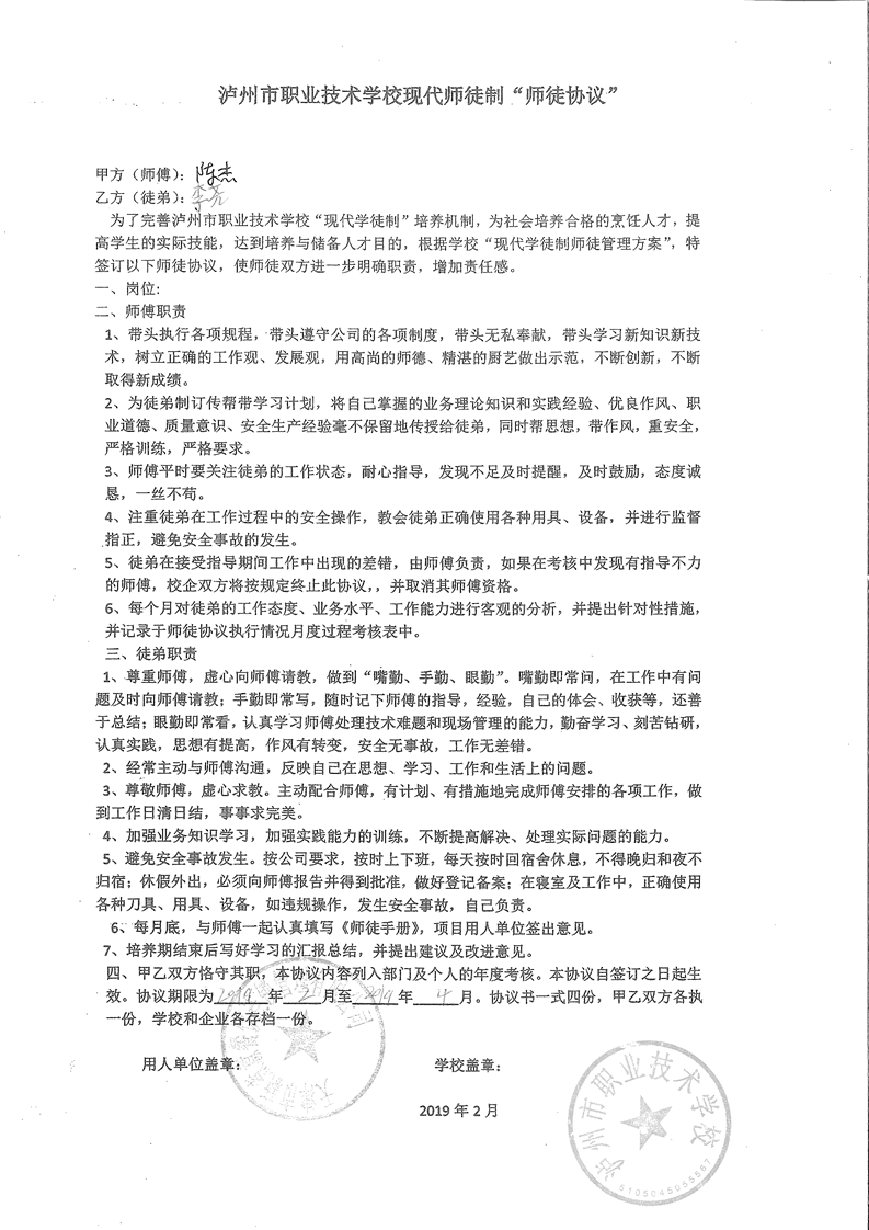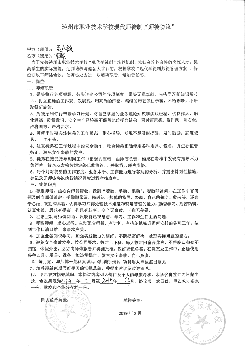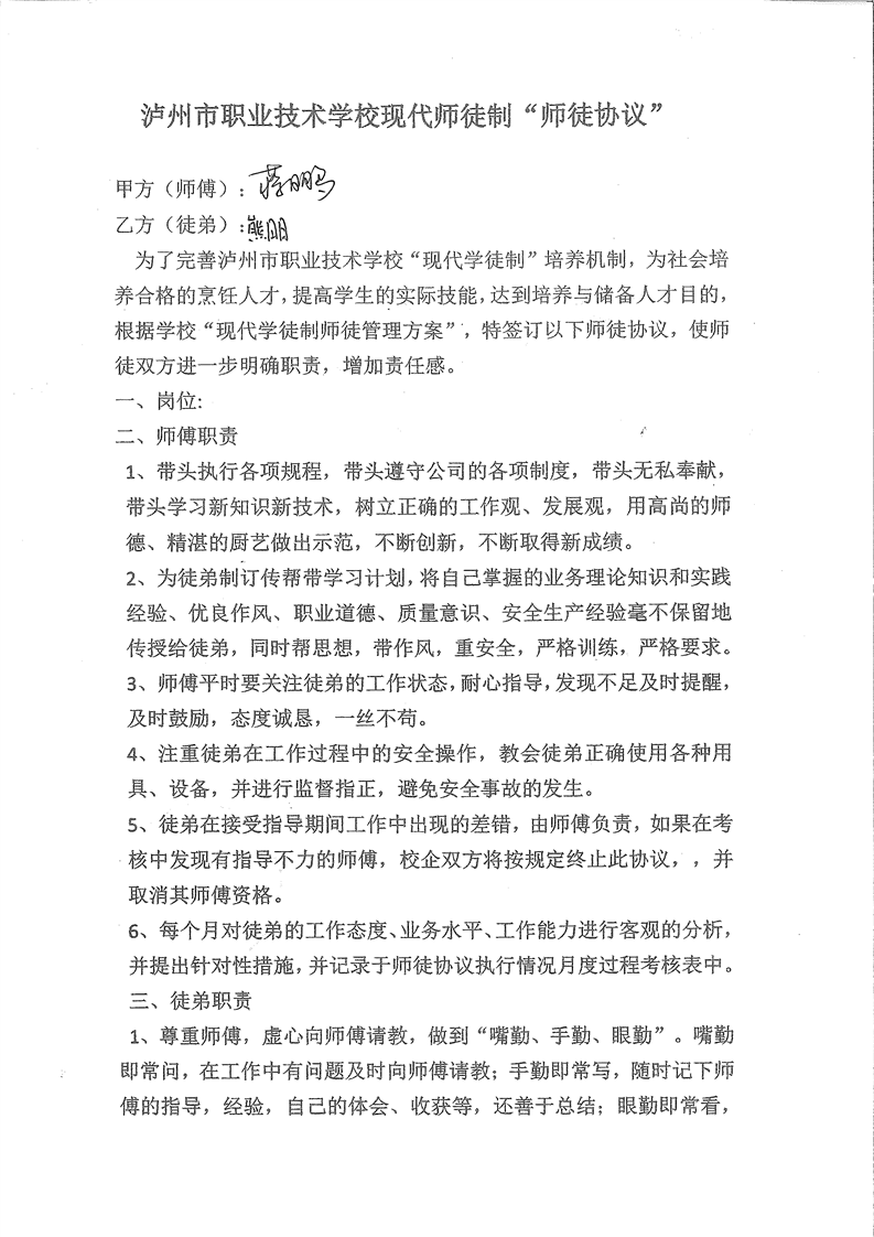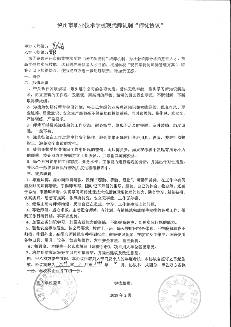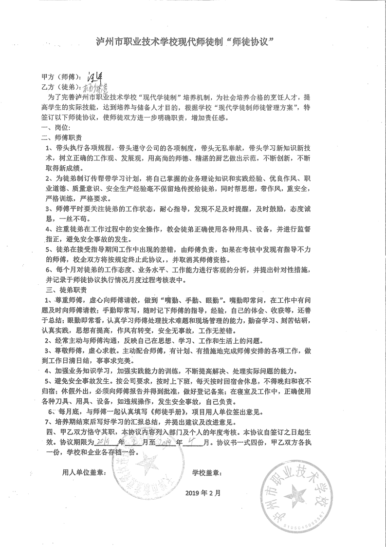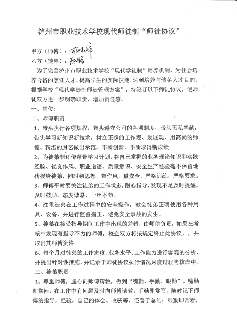 当前页面:中餐烹饪终期验收 >> 专业建设任务 >> 1.2创新人才培养模式 >> 1.2.2深化校企合作协同育人模式改革 >> 1.2.2.3现代学徒制