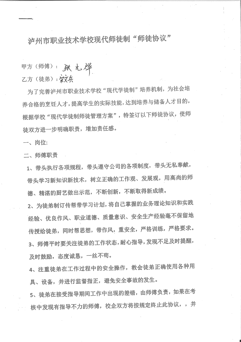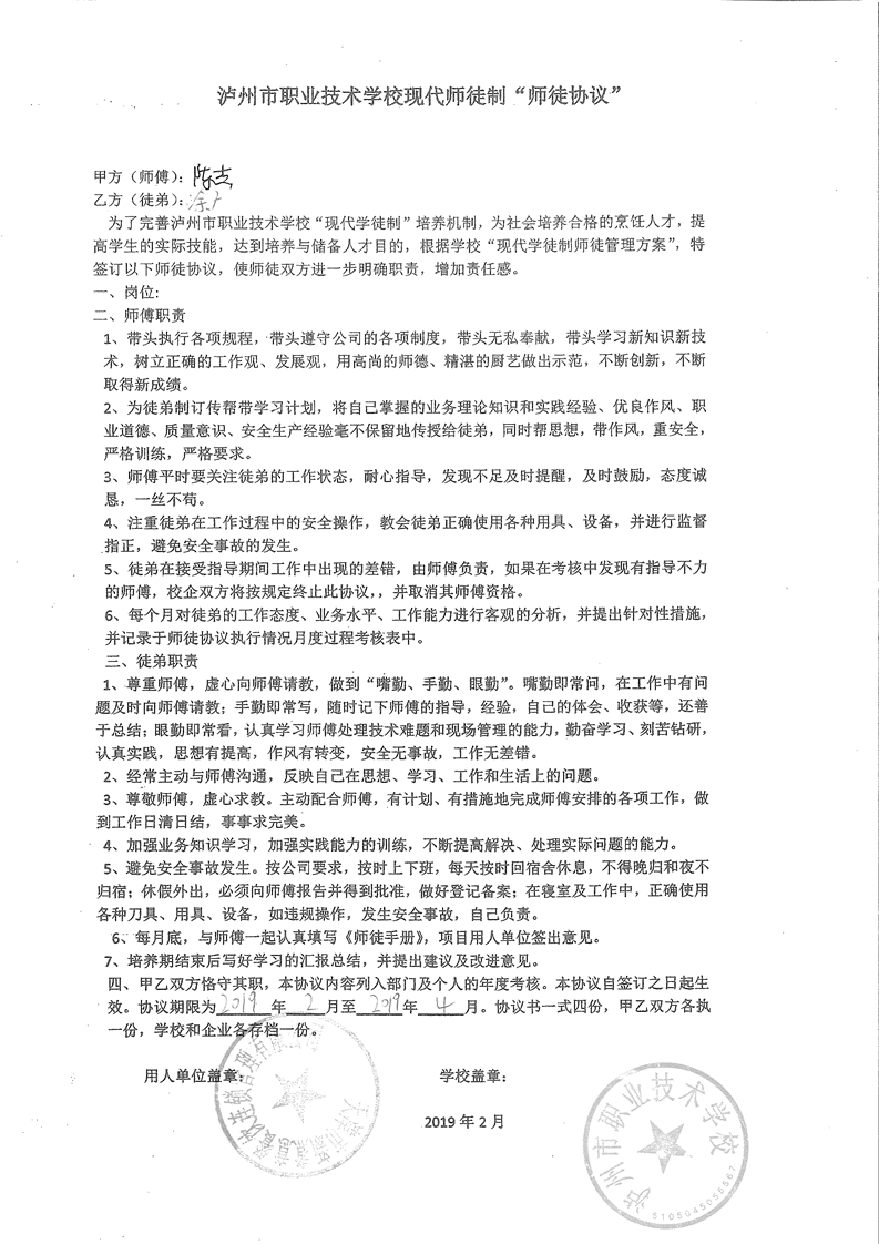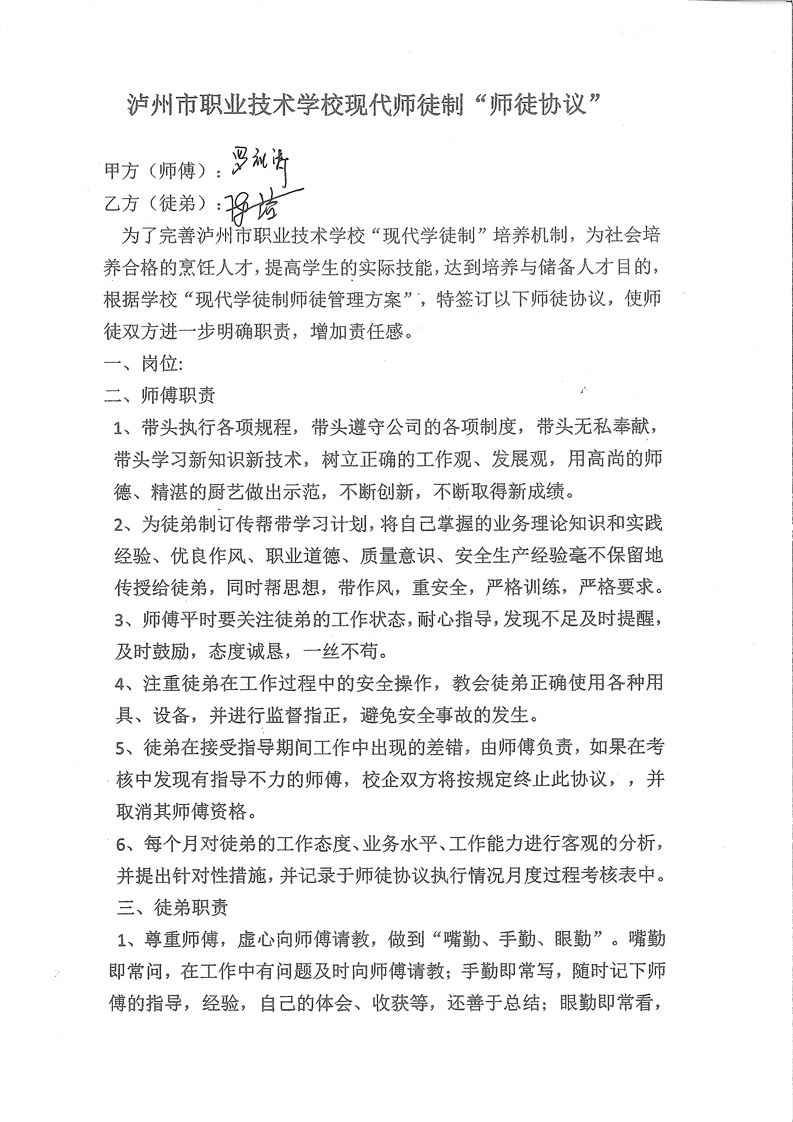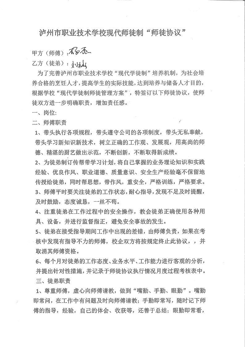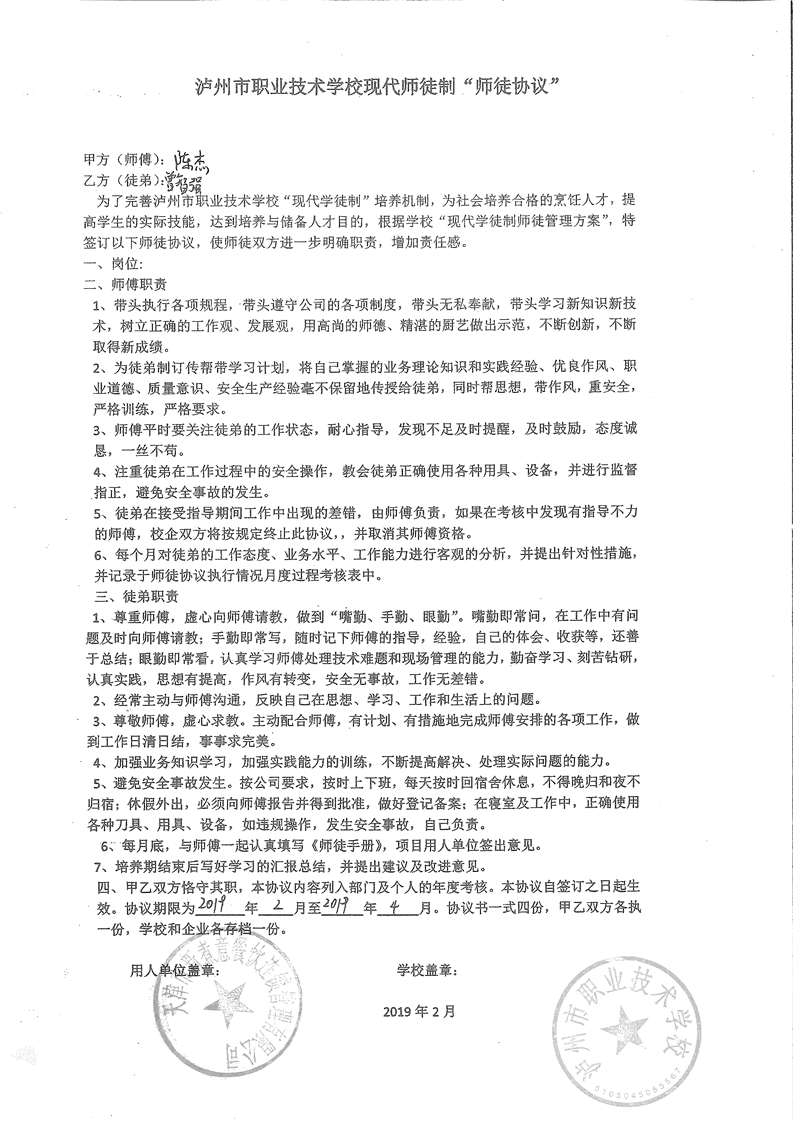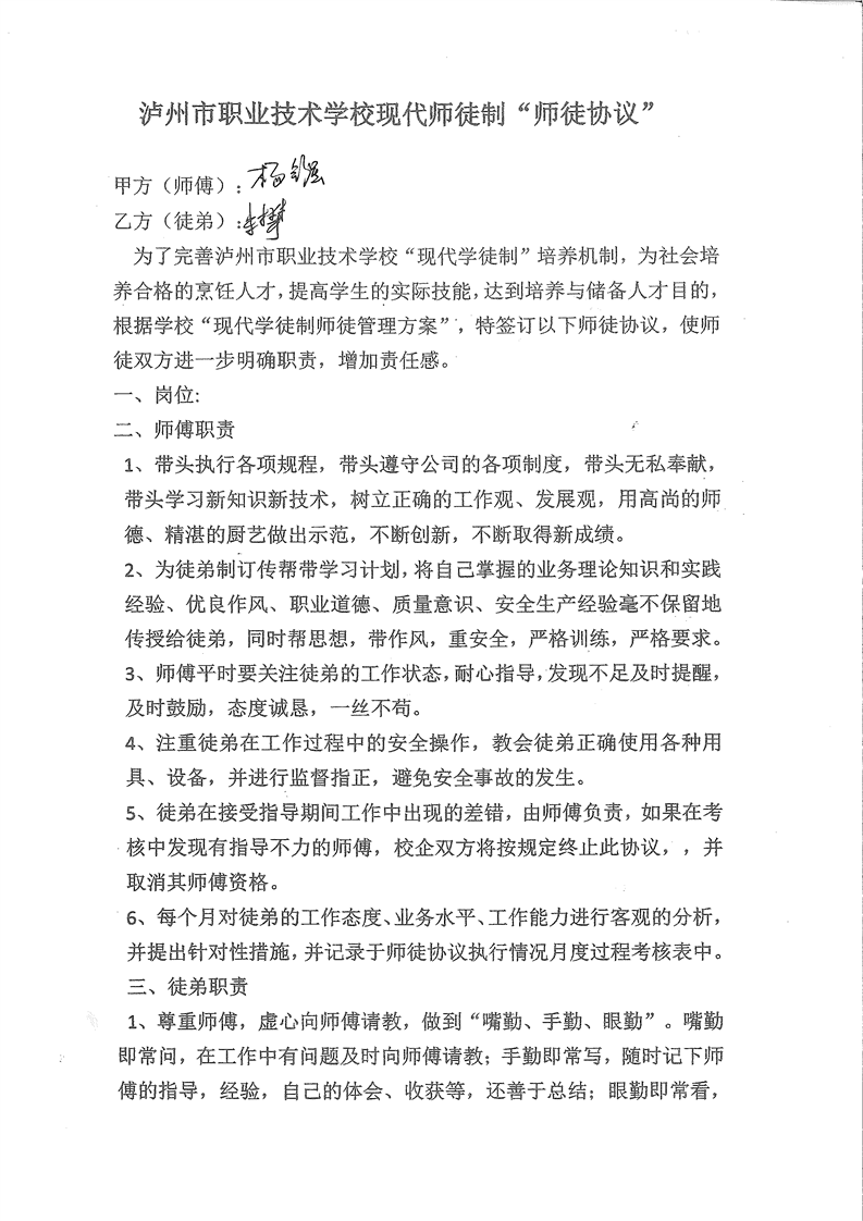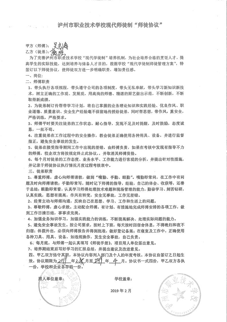 当前页面:中餐烹饪终期验收 >> 专业建设任务 >> 1.2创新人才培养模式 >> 1.2.2深化校企合作协同育人模式改革 >> 1.2.2.3现代学徒制