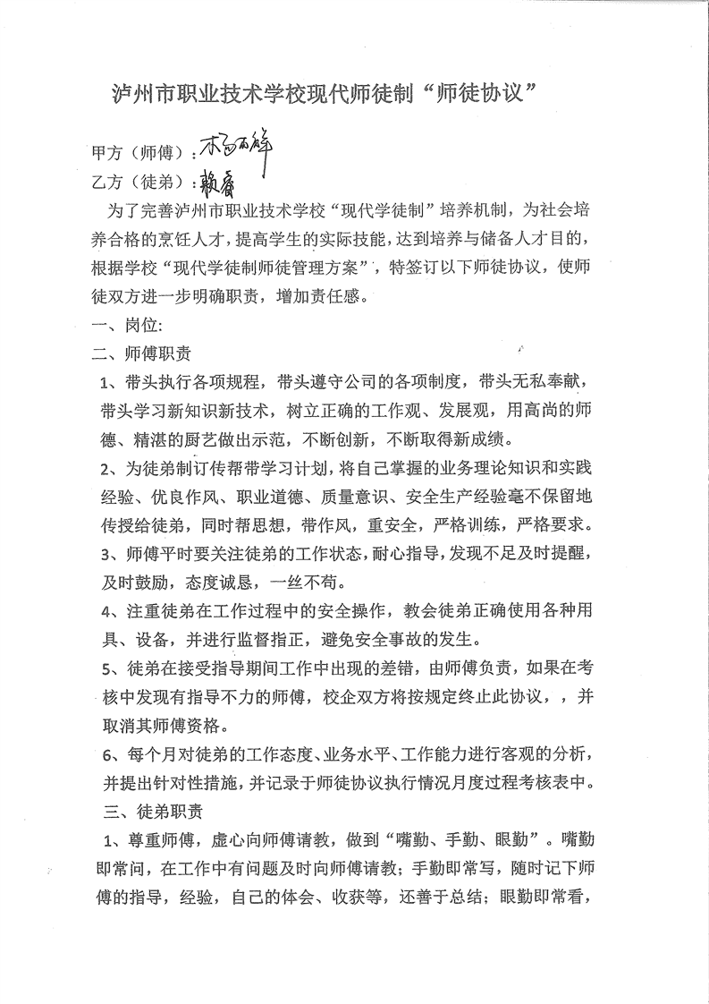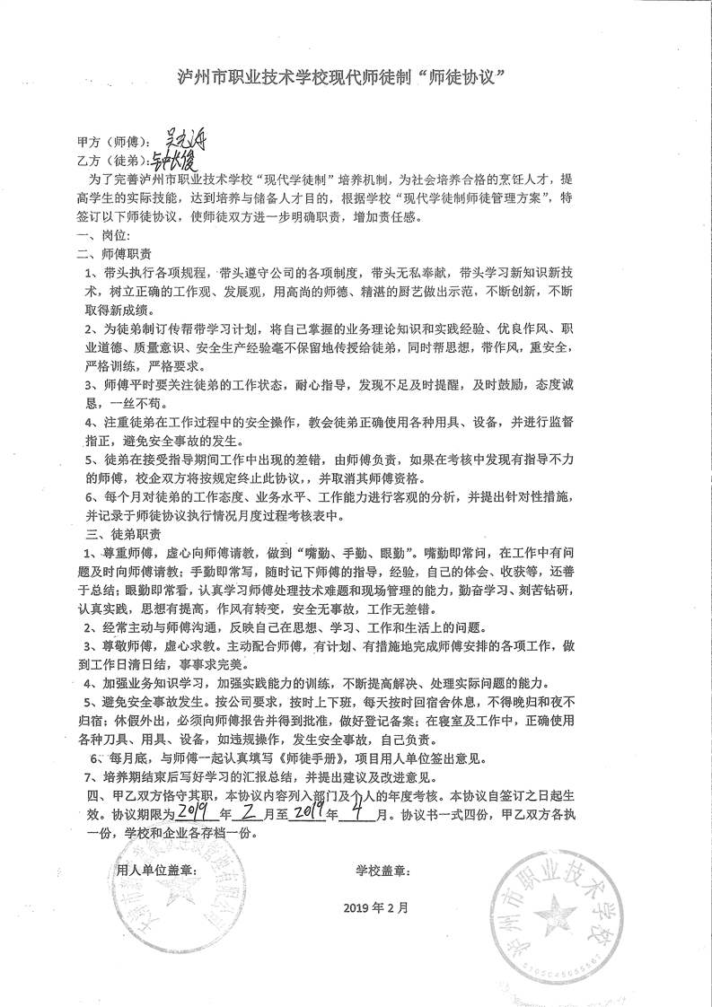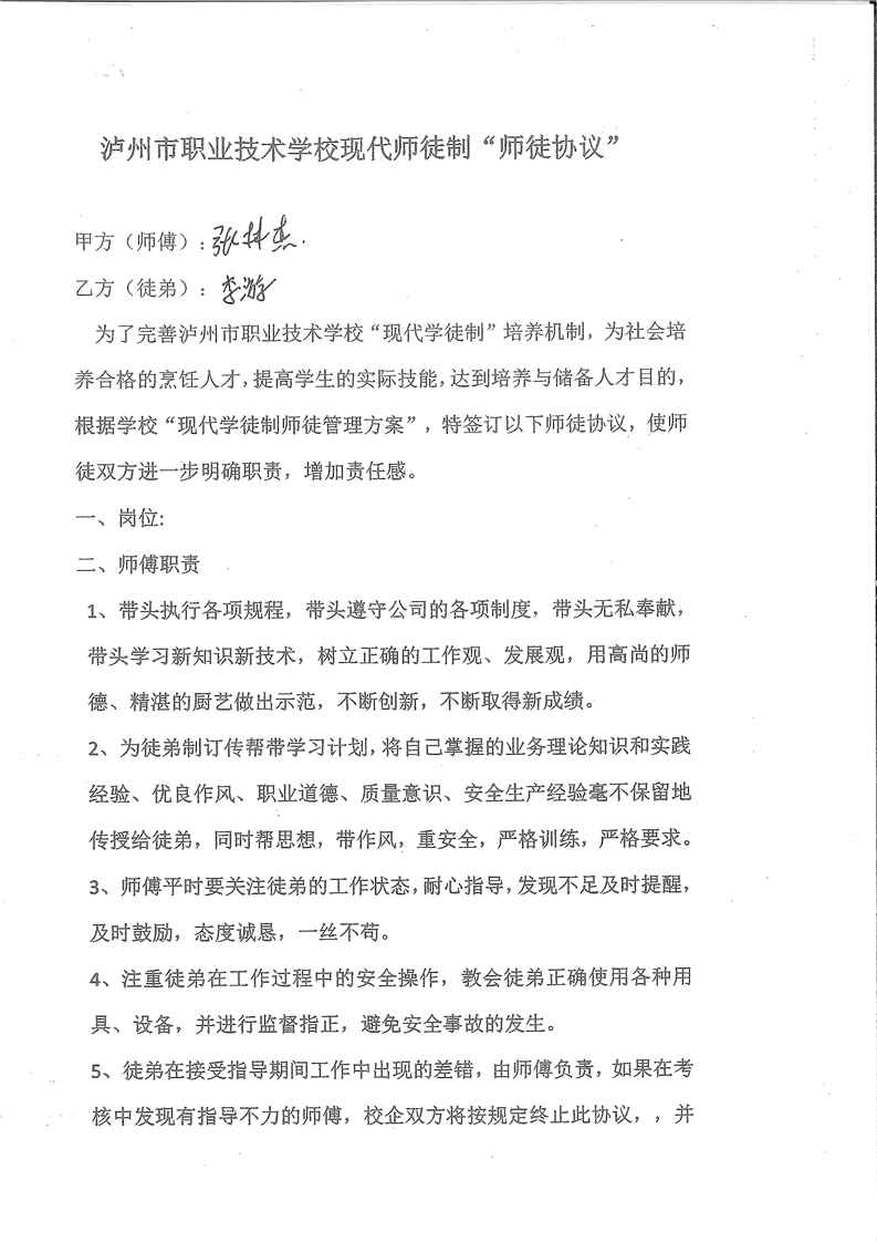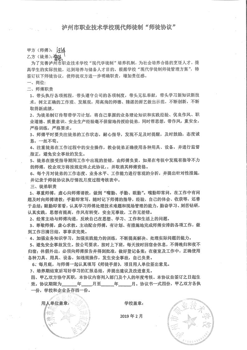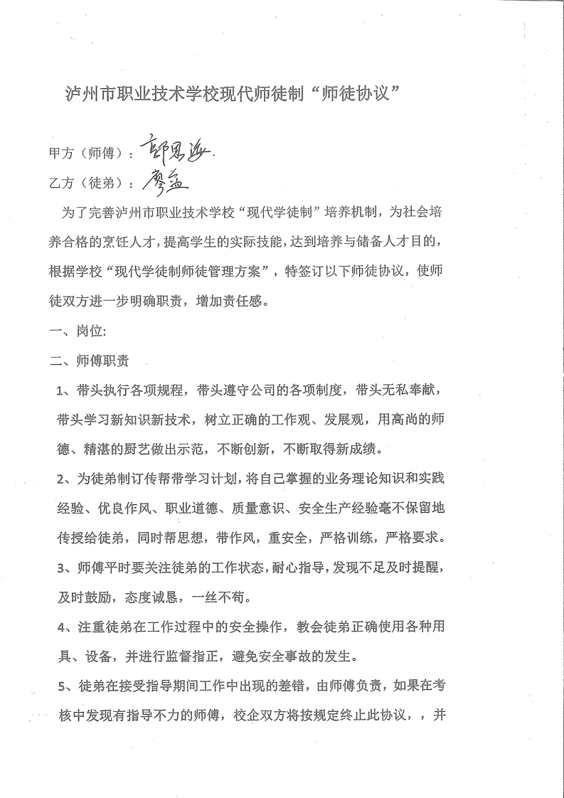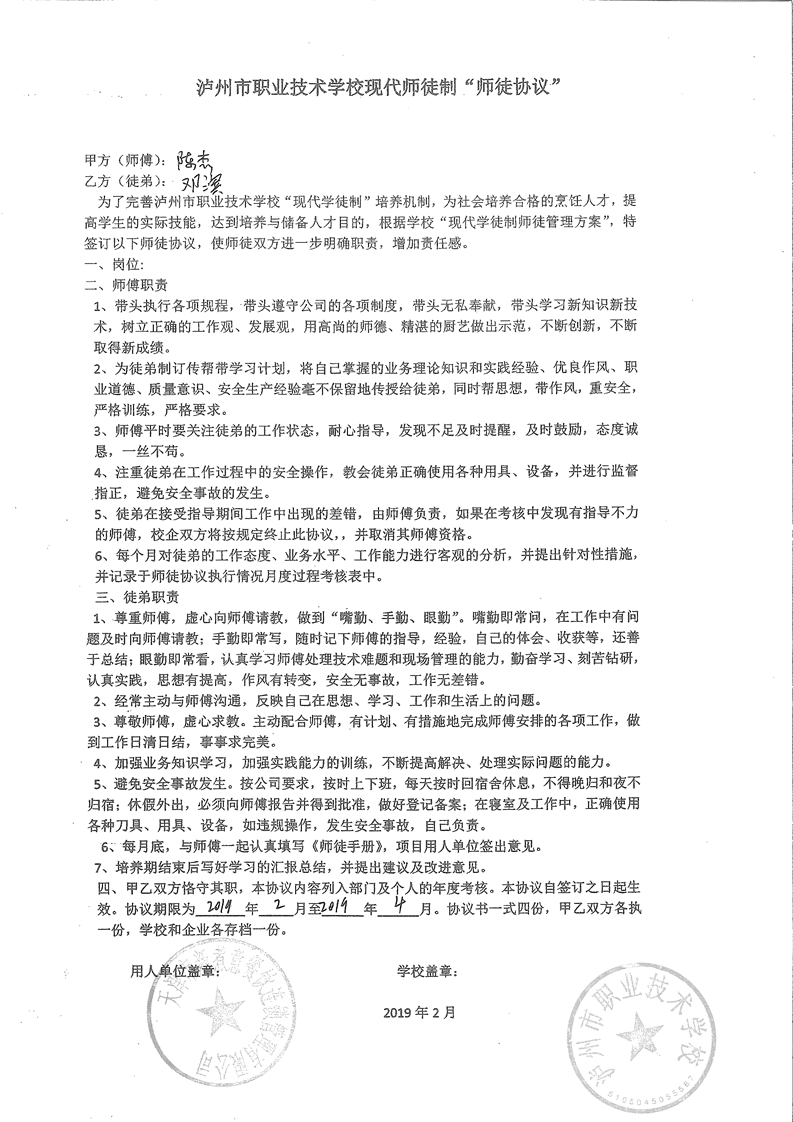 当前页面:中餐烹饪终期验收 >> 专业建设任务 >> 1.2创新人才培养模式 >> 1.2.2深化校企合作协同育人模式改革 >> 1.2.2.3现代学徒制