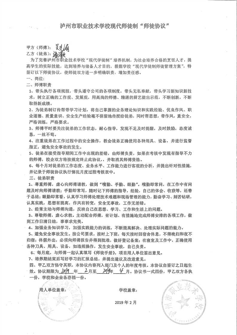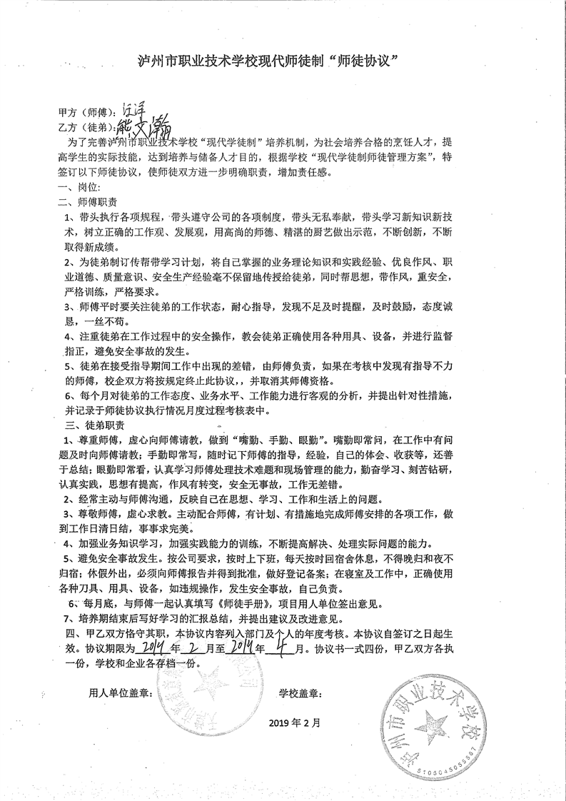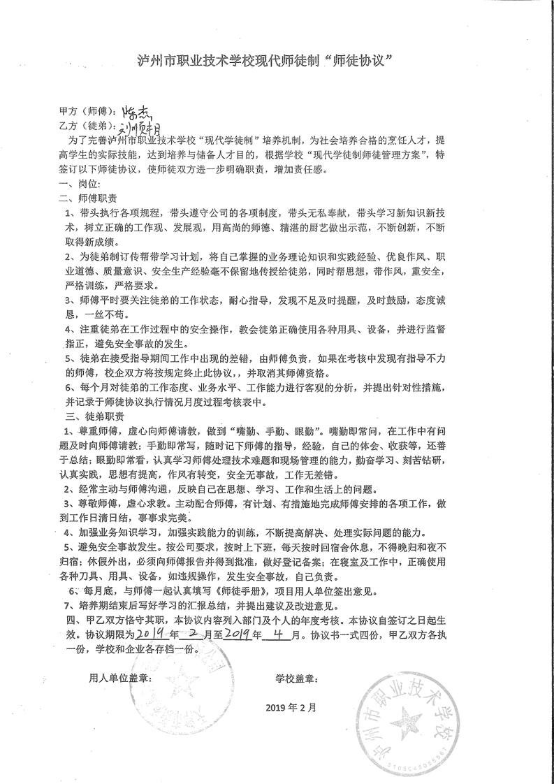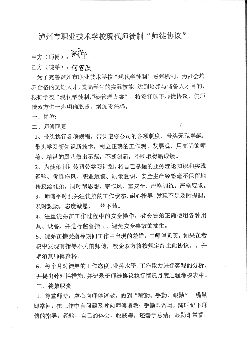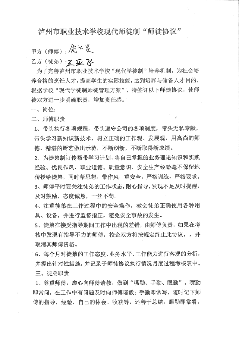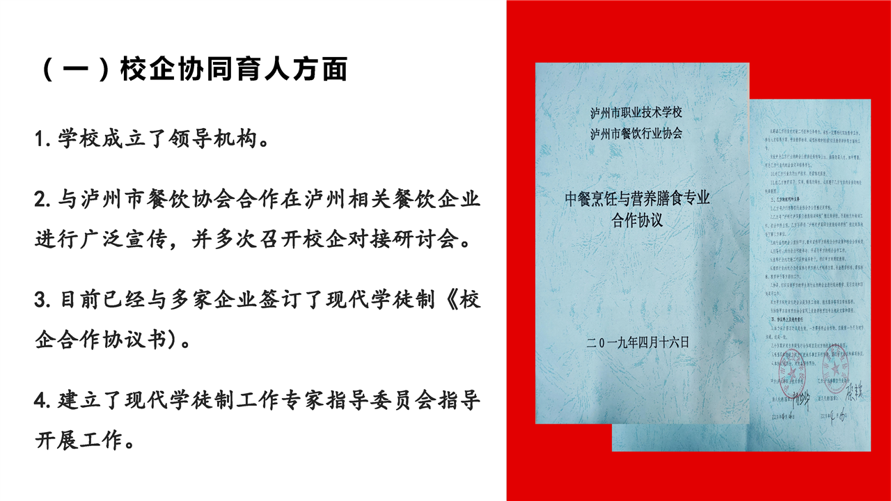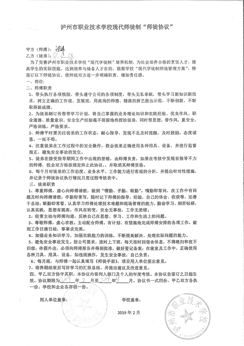 当前页面:中餐烹饪终期验收 >> 专业建设任务 >> 1.2创新人才培养模式 >> 1.2.2深化校企合作协同育人模式改革 >> 1.2.2.3现代学徒制