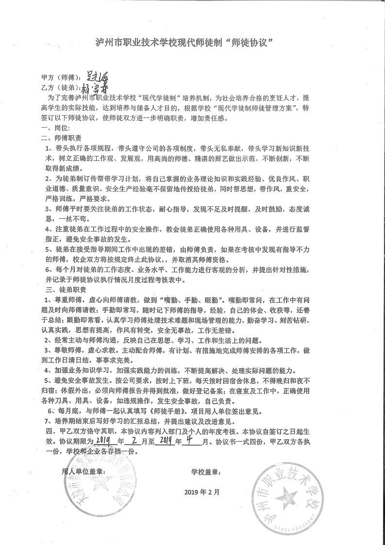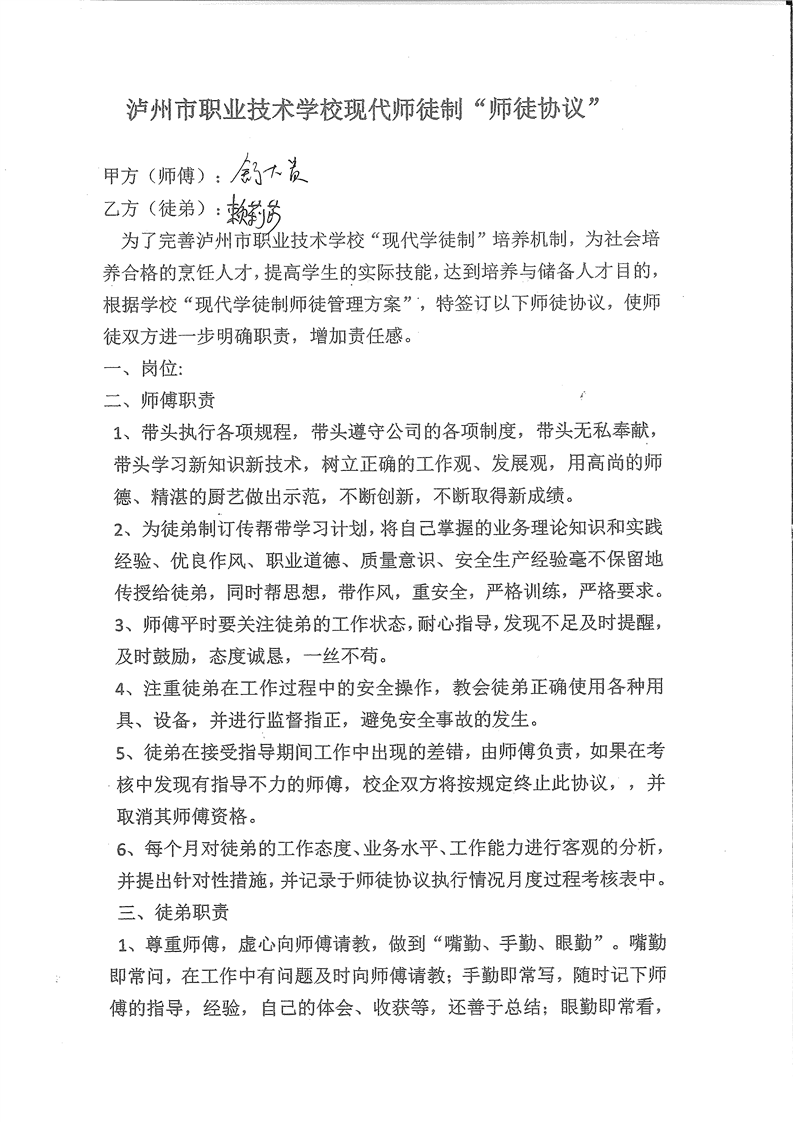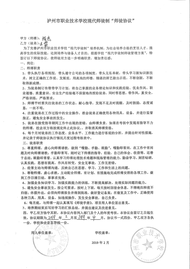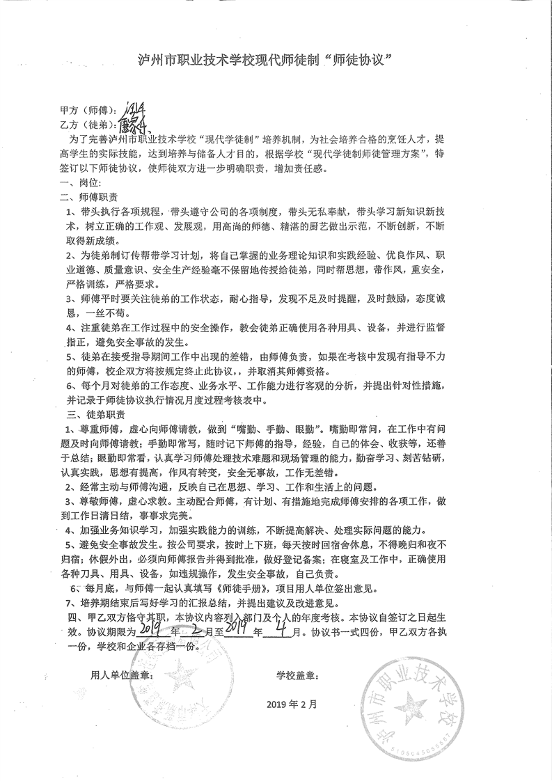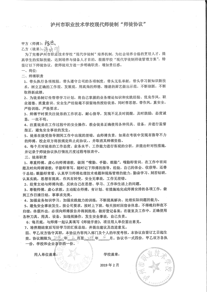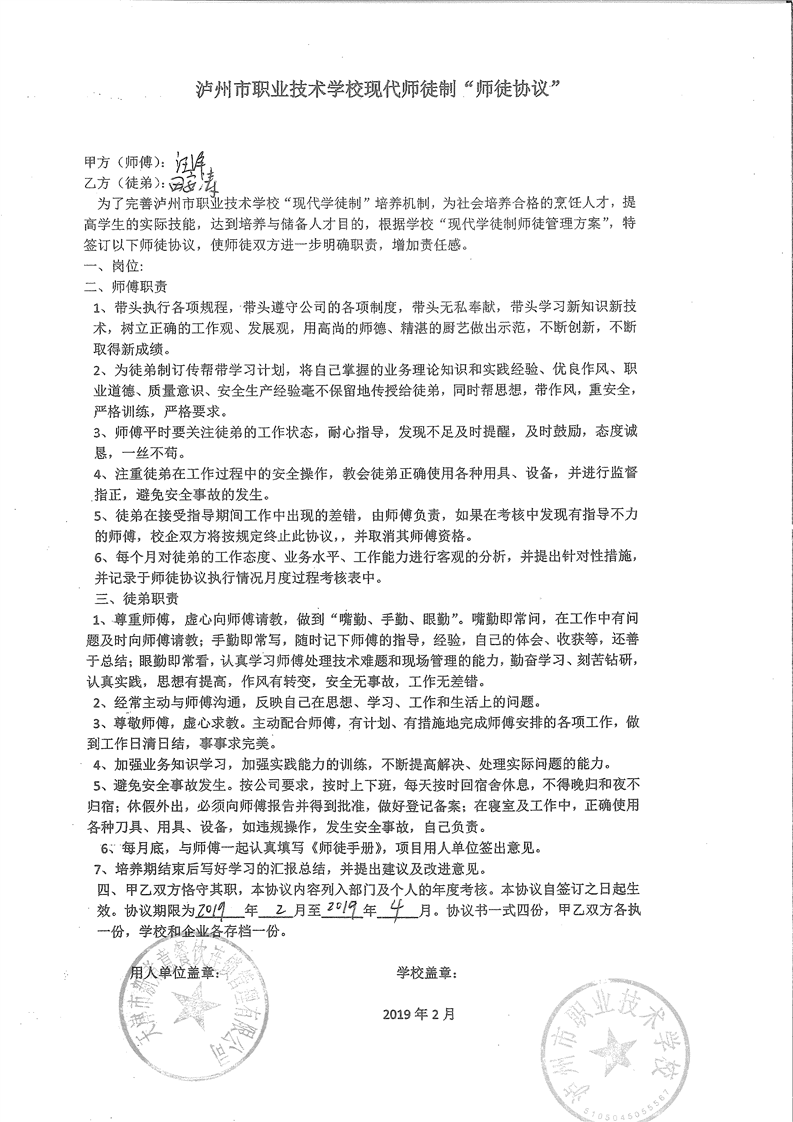 当前页面:中餐烹饪终期验收 >> 专业建设任务 >> 1.2创新人才培养模式 >> 1.2.2深化校企合作协同育人模式改革 >> 1.2.2.3现代学徒制