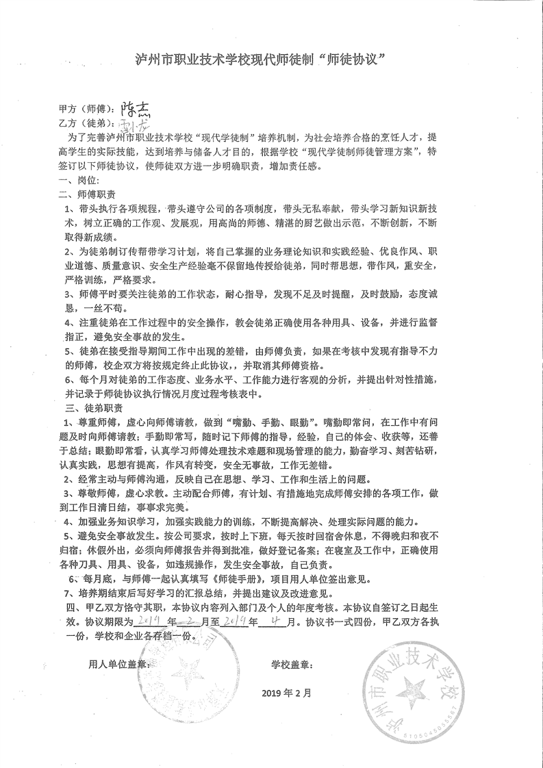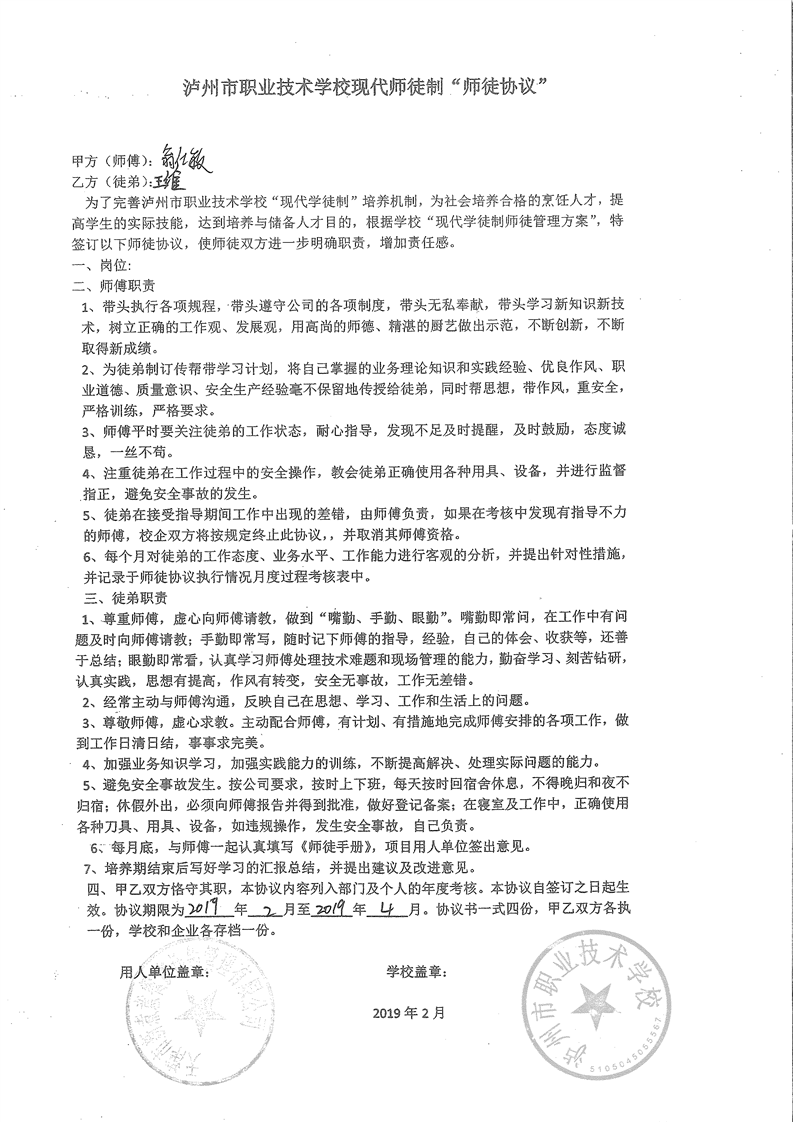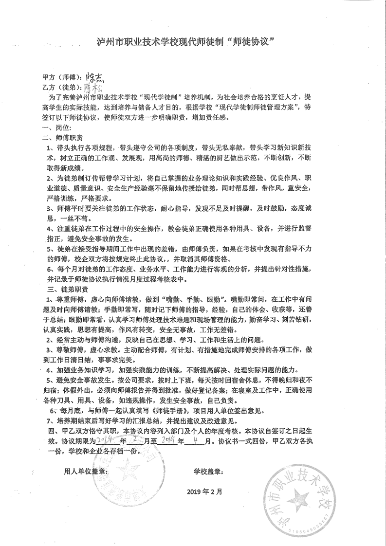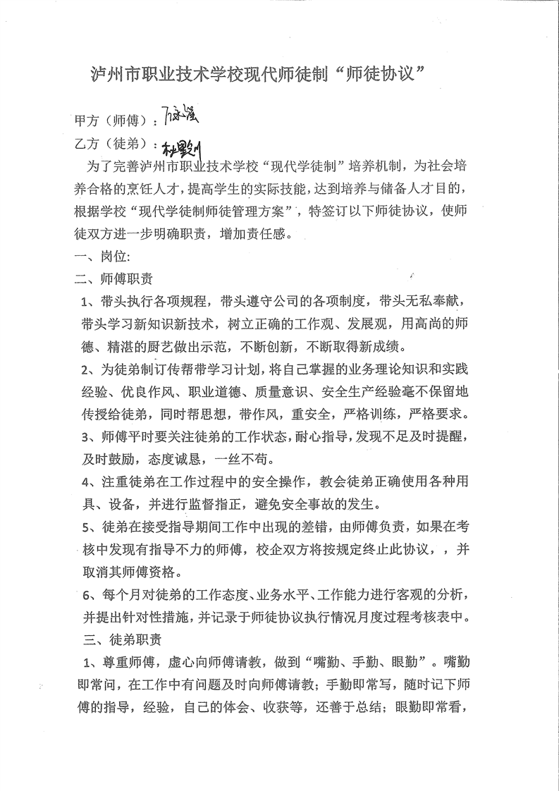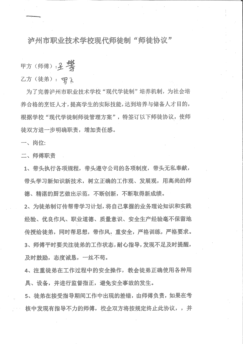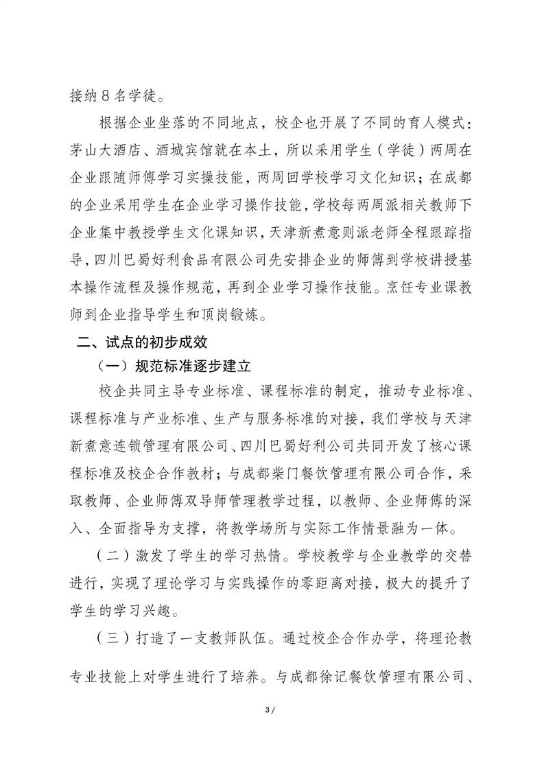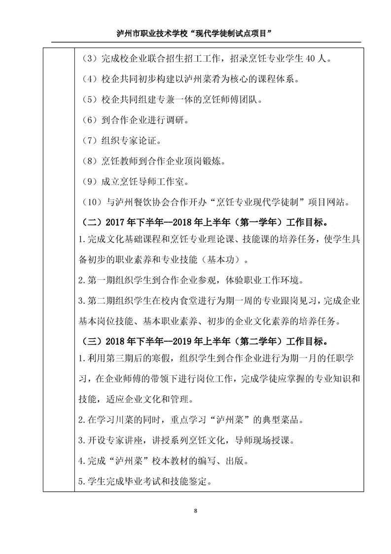当前页面:中餐烹饪终期验收 >> 专业建设任务 >> 1.2创新人才培养模式 >> 1.2.2深化校企合作协同育人模式改革 >> 1.2.2.3现代学徒制