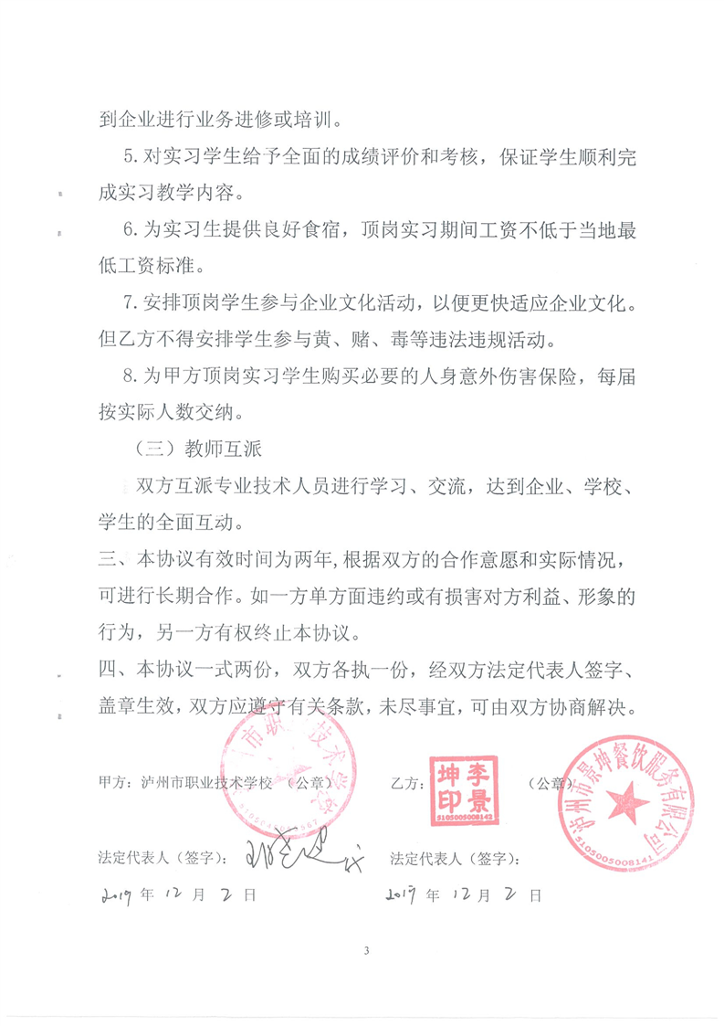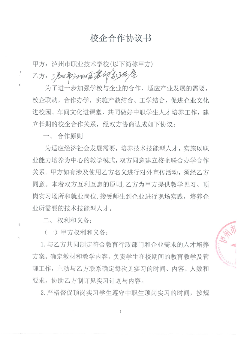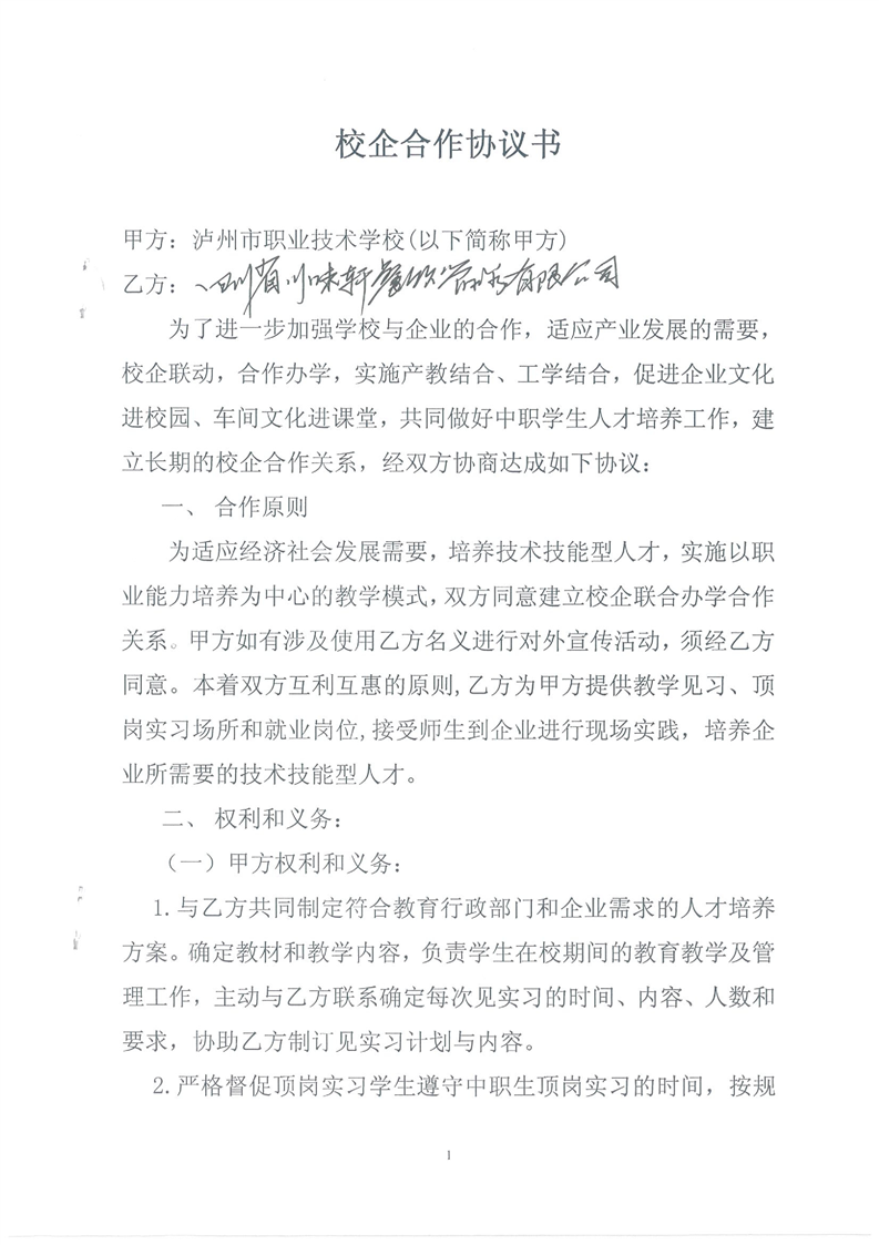 泸州市职业技术学校中餐烹饪专业校企合作协议