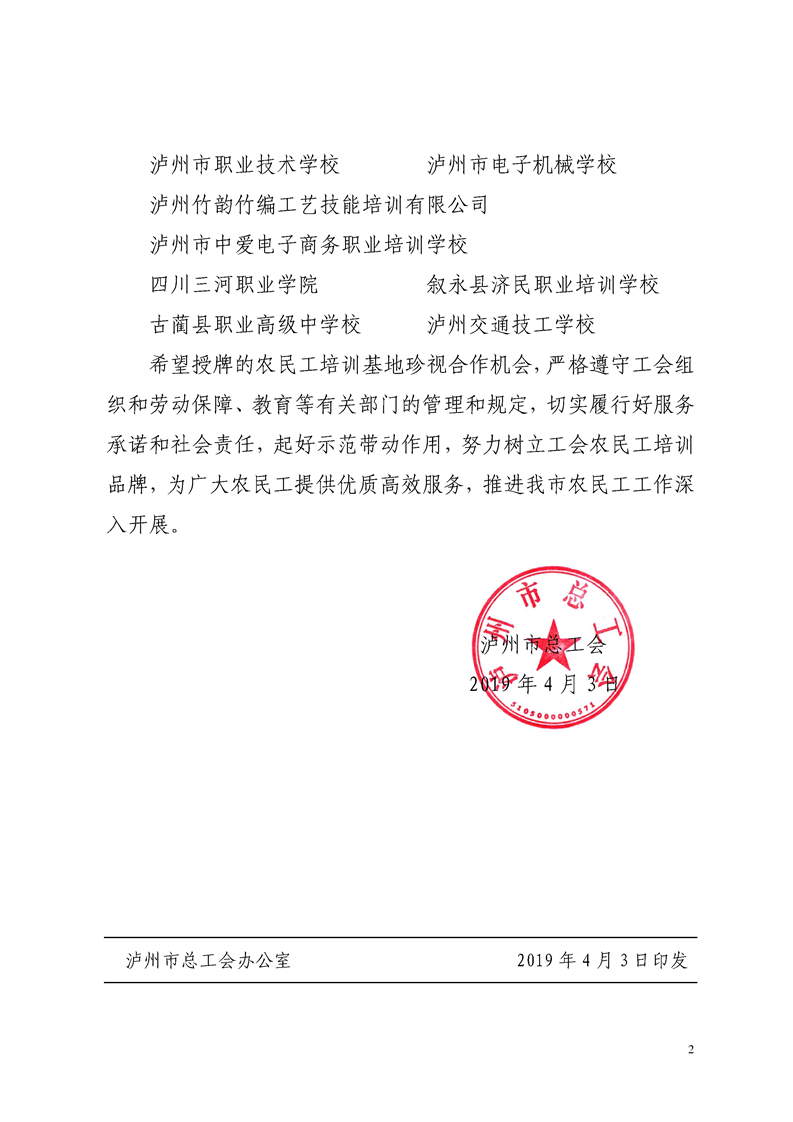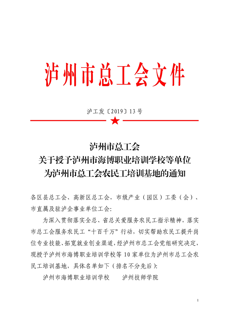 泸州市总工会关于授予泸州市海博职业培训学校等单位为泸州市总工会农民工培训基地的通知