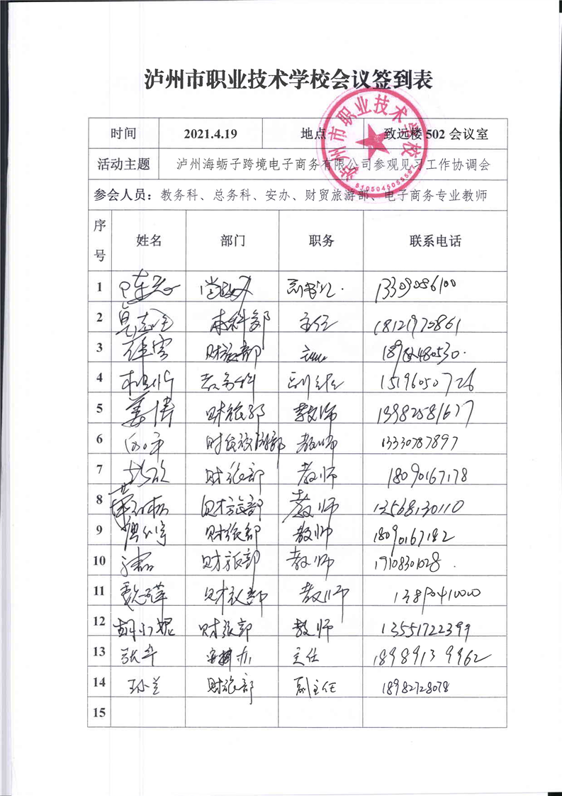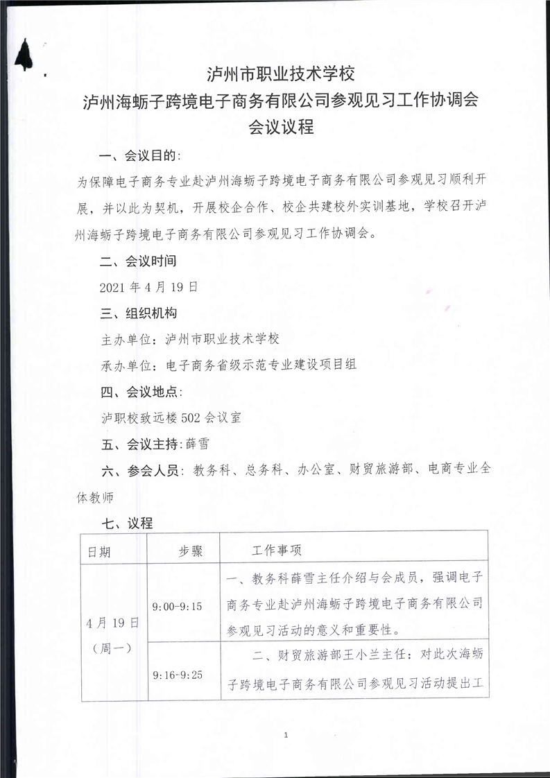 泸州海蛎子跨境电商股份有限公司参观工作协调会教研会议(会议议程、签到表、照片)