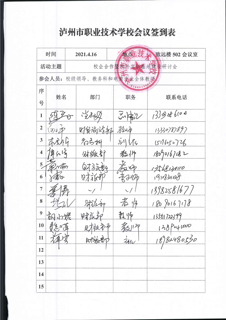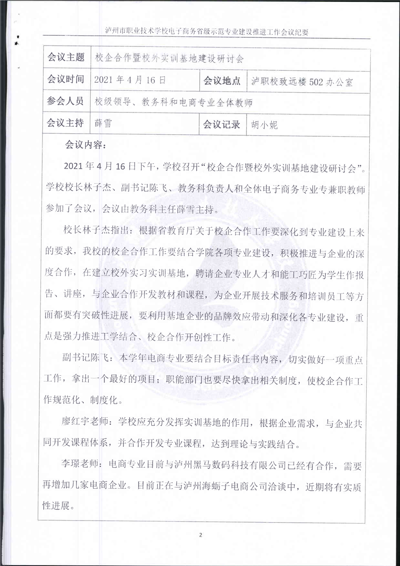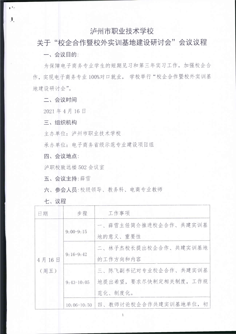 泸州市职业技术学校“校企合作暨校外实训基地建设研讨会”(会议议程、签到表、会议纪要)