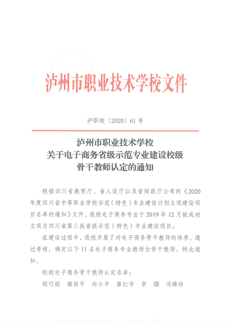 关于电子商务省级示范专业建设校级骨干教师认定的通知
