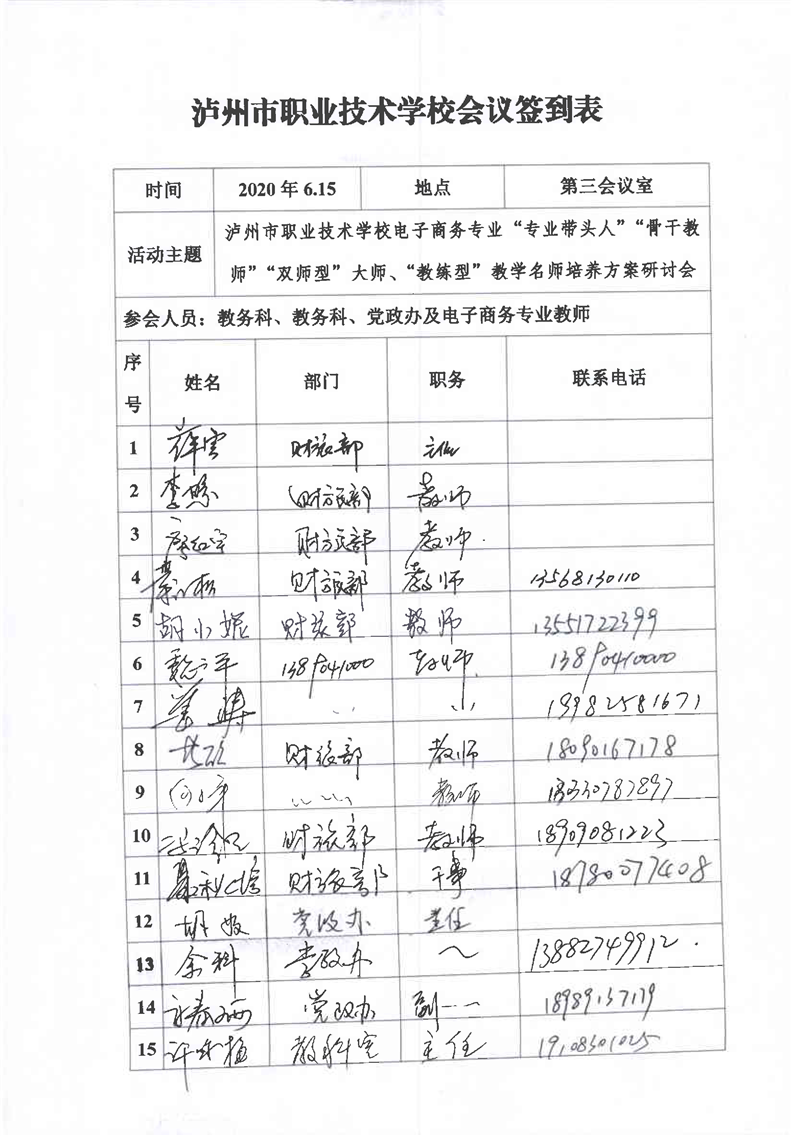 专业带头人、骨干教师、双师型大师、教练型教学名师培养方案研讨会签到表