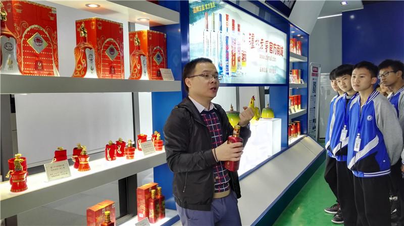 在泸州老窖电商公司中心展厅,该公司副总经理吴国正为同学们详细介绍了公司的基本概况,并就公司近年来成功推出的“桃花醉”、“三人炫”和鸡尾酒等经典产品作了实物展示和讲解。