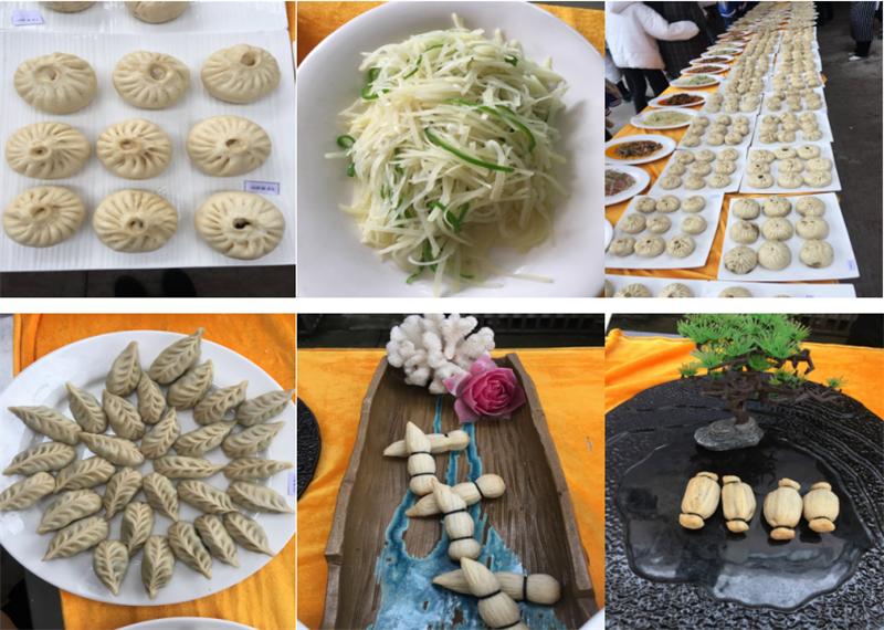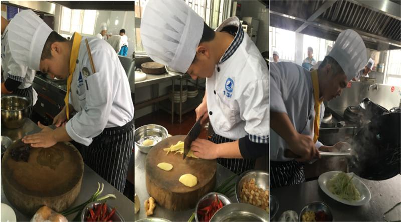 在裁判,计时员一声令下,参赛选手们立即投入到了紧张有序的比赛中。热菜组的参赛选手们可谓所有项目中时间最紧,要求最高的一组,不仅要出色的完成两道菜品的制作,其中一道青椒土豆丝更是要求从初加工、刀功切配、烹制到出菜十分钟内完成,并要求粗细均匀,不连刀。看似简单,却综合考察了参赛选手的刀功,勺功等烹饪基本功,真可谓 “台上一分钟,台下十年功”。其他项目的参赛选手们同样训练有素,忙中不乱,按部就班,其中面点组一眼望去清一色的女参赛选手成为了一道靓丽的风景,她们的参赛氛围虽然不像热菜,刀功、雕刻组选手们那样热火朝天,一招一式却也巧劲十足,手下生花,尽显女生们的优势和强项,让人感叹“谁说厨房就是男生们的天下”。 通过激烈的比拼,新煮意组王毅、李红、胡涛;16级面点组曾和杨、赵永,17级面点组杨诗雨、尹好婷;16级雕刻组李村郴;17级刀工组谢兰林等同学表现优异,分获各组一等奖。