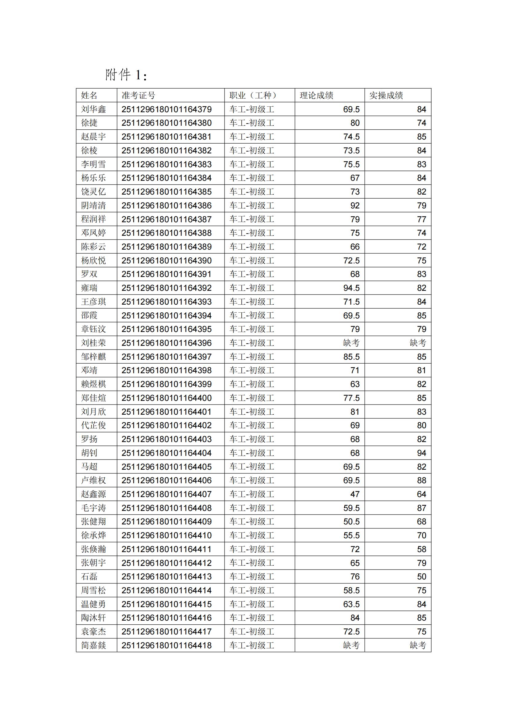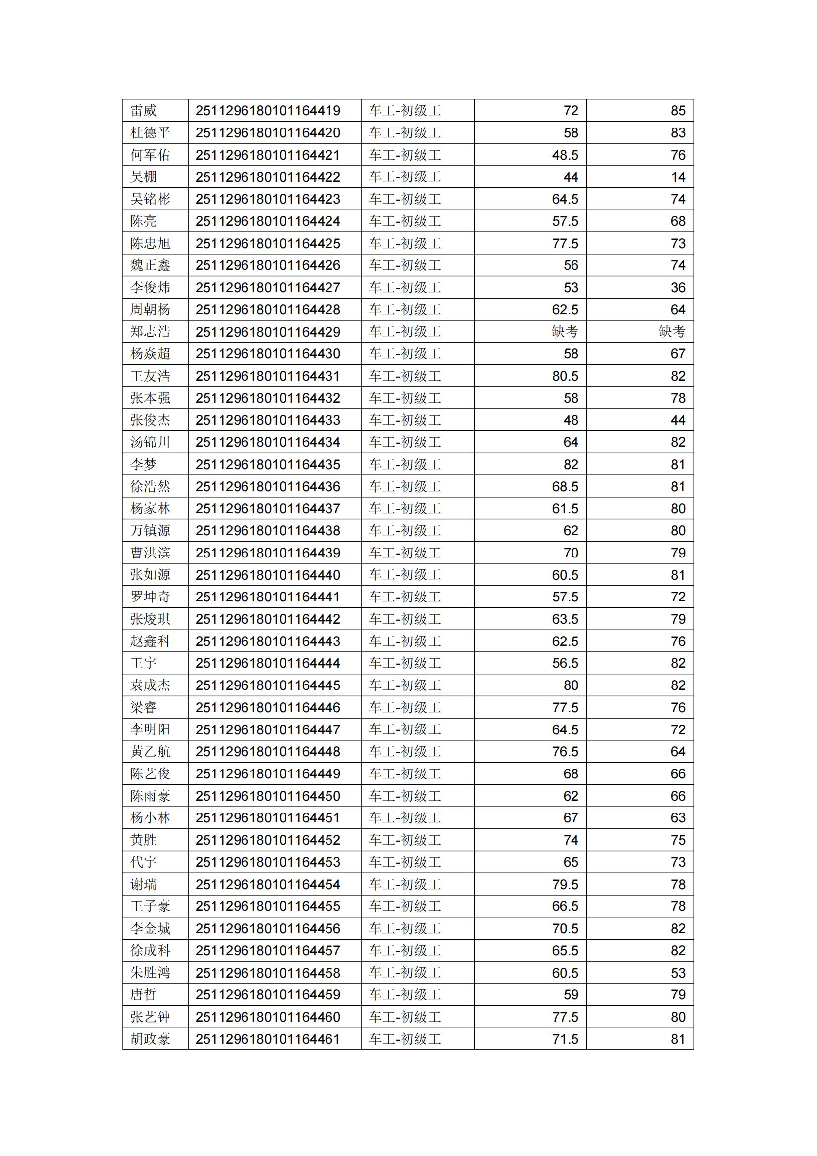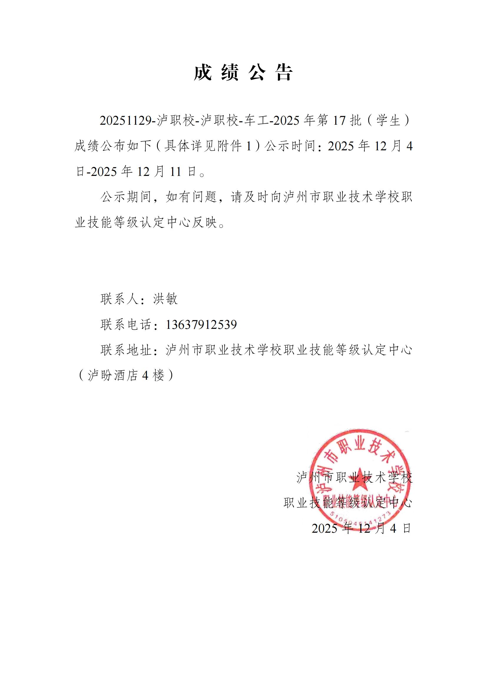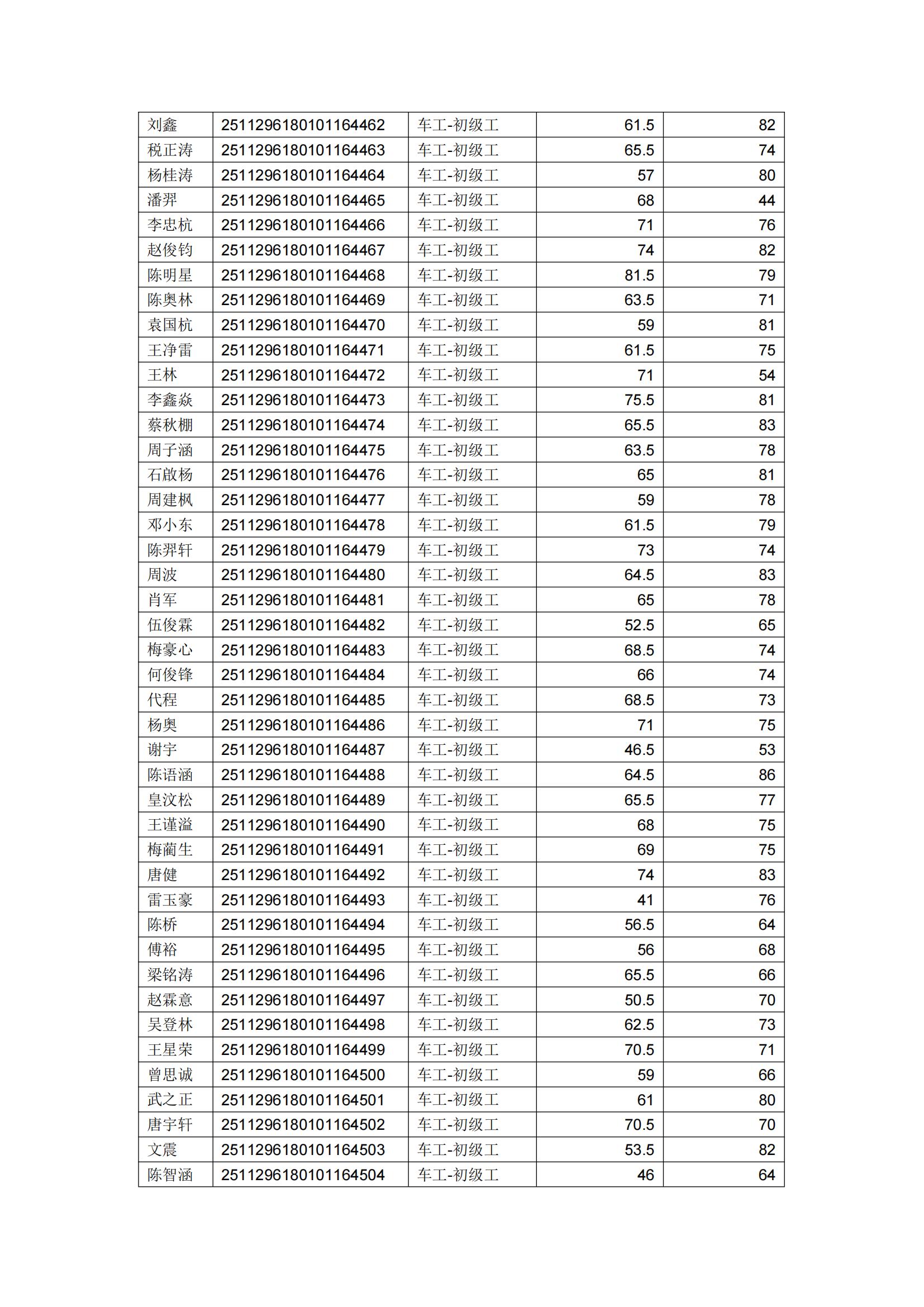 泸州市职业技术学校2025年11月29日车工五级职业技能等级认定成绩公示